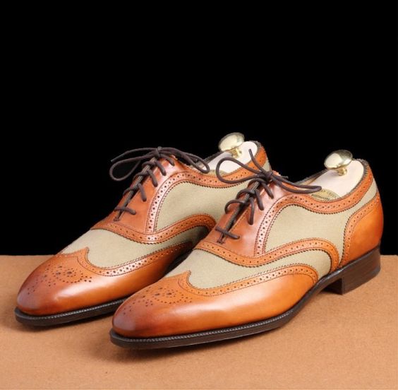 Classic Men's Handmade Brown Beige Wingtip Oxford Specially Design Lace Up Shoes