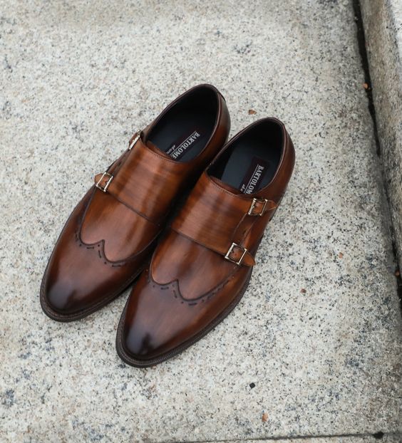 Unique Men's Brown Attractive Style Leather Shoes, Hand Stitch Double Monk Wedding Shoes