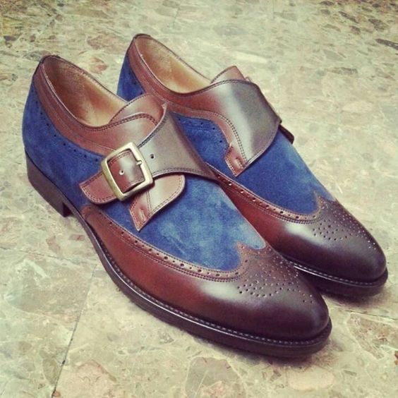 Elegant Men's Hand Stitch Brown Blue Shoes, Single Monk Strap Leather Suede Formal Shoes