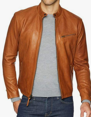 Men's Tan Brown Sheep Skin Center Zip Leather Jacket