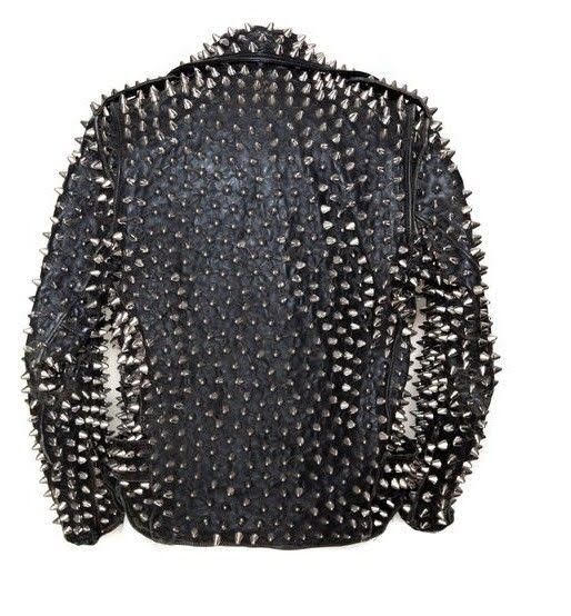 New Men's Full Black Punk Silver Long Spiked Studded Leather Brando Jackets