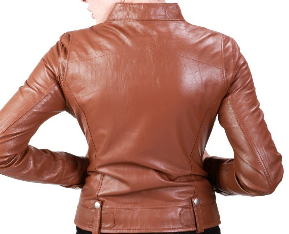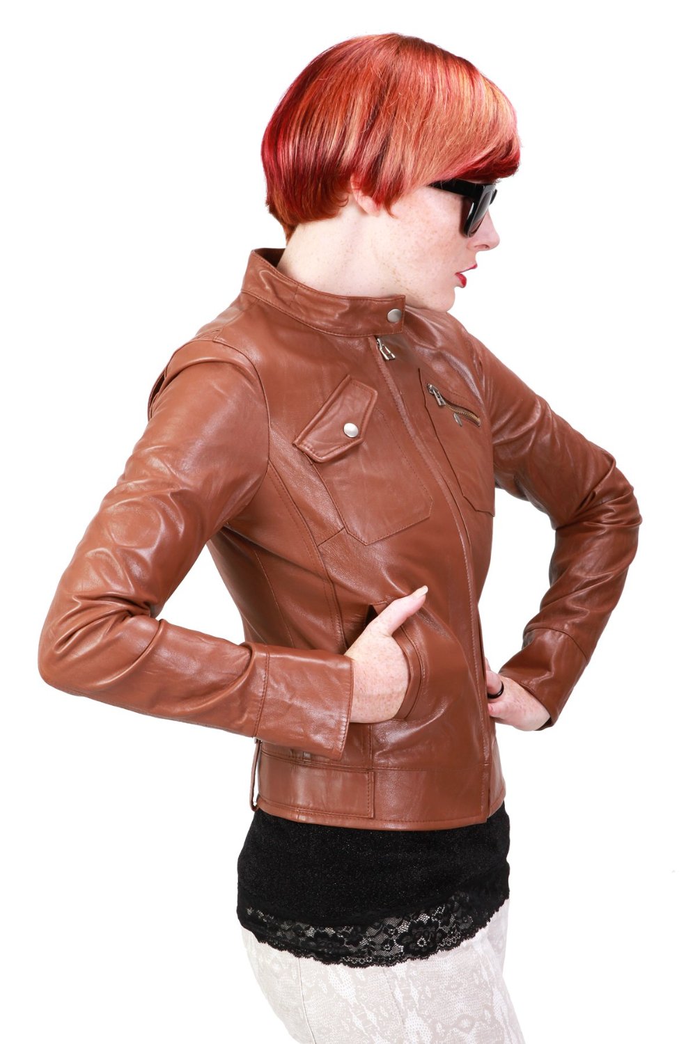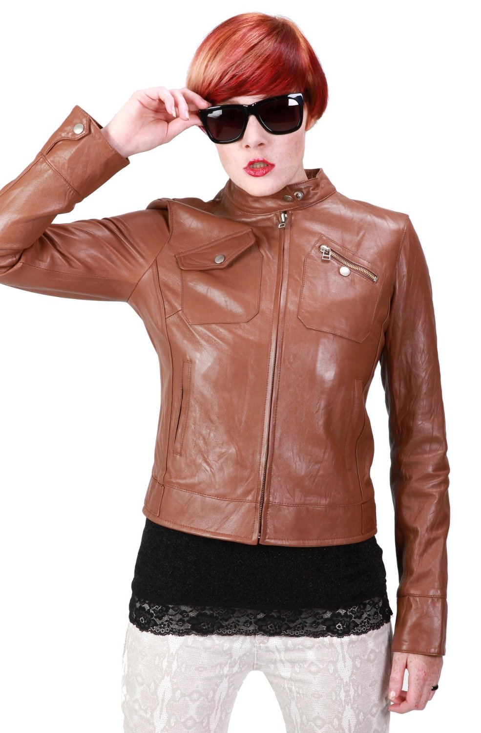 Luxury Decent Brown Genuine Leather Fashion Christmas Jacket, Slim Fit With Front Zipper Jacket For Girls