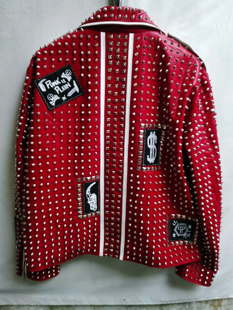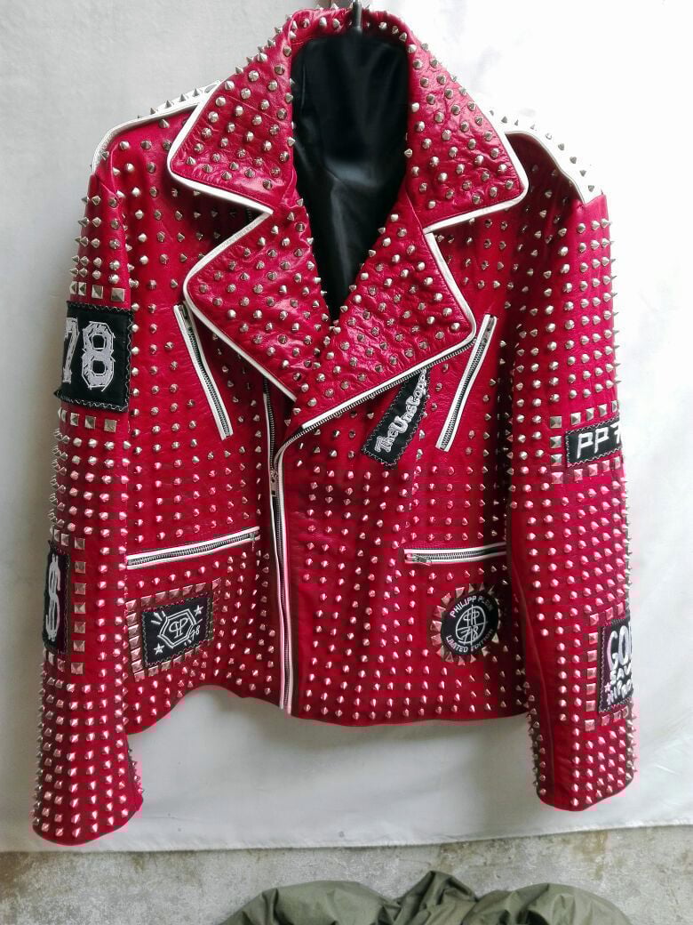 NEW CLASSIC HAND STITCHED MEN'S RED STUDDED PUNK ROCK LEATHER JACKET