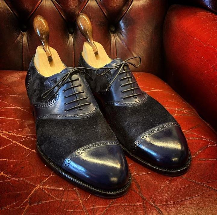 Trendy Men's Hand Stitch Black Leather Suede Cap Toe Shoes, Lace Up Formal Shoes