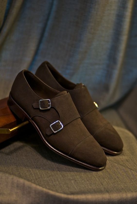 Hot Style Dark Brown Double Monk Strap Shoes, Handmade Suede Wedding Shoes